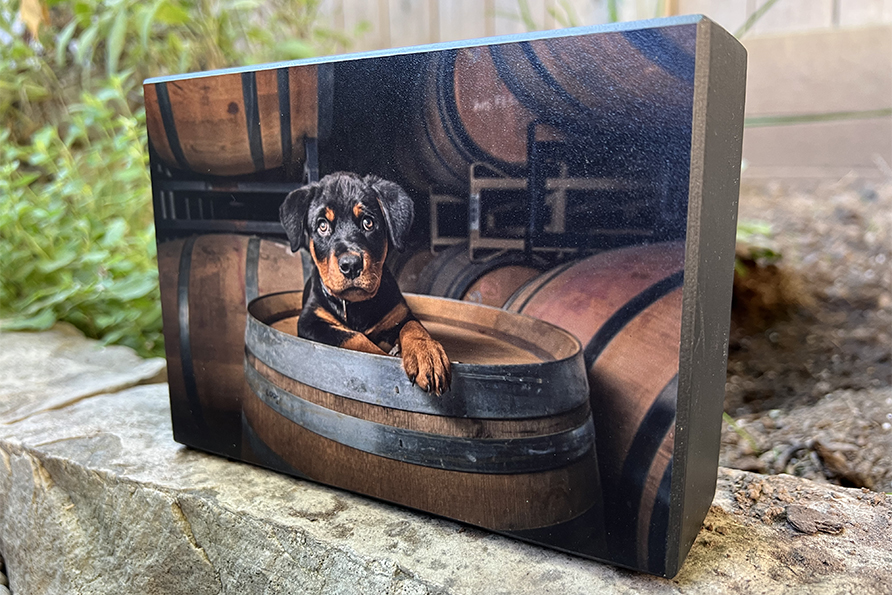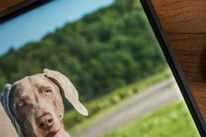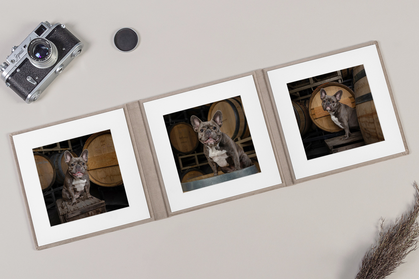 Your 3 favourite images in a vegan leather trifold. Choose your colour. Folds to 7 inches square. Includes your dog’s name etched on the cover!