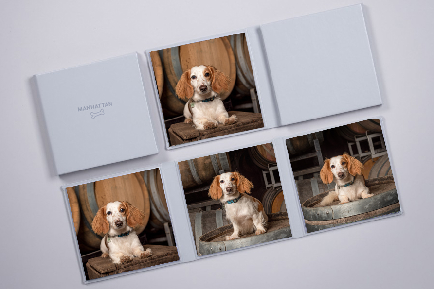 Your choice of 3 favourite images in a vegan leather triptych. Choose your colour. Folds to 7 inches square. Includes your dog’s name etched on the cover!